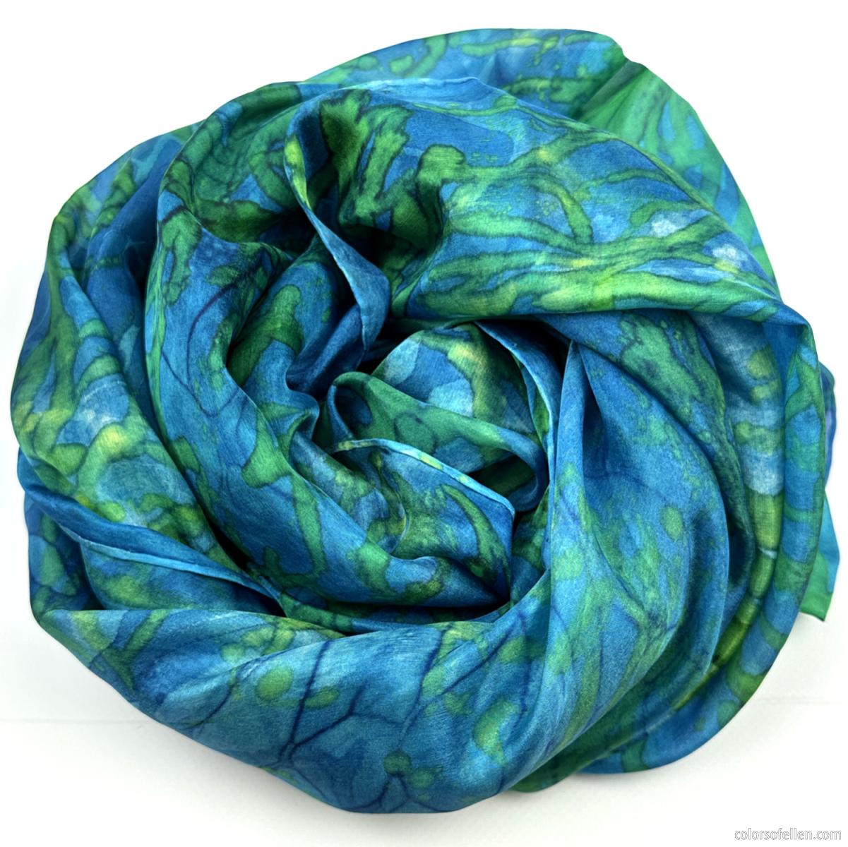 Blauw- en groentinten vormen samen een grafisch, gelaagd patroon met duidelijke vormen en lijnen. De opbouw van kleur en structuur geeft de sjaal een eigen, herkenbaar karakter.