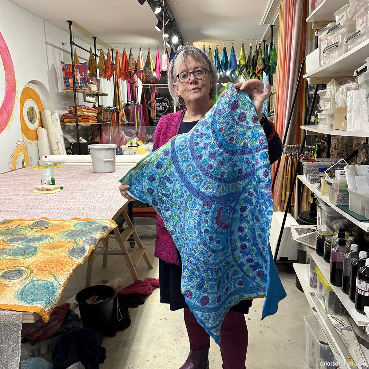 In de middag gaan we de beschilderde zijde vervilten met wol (voorvilt). Met behulp van de viltmachine start het viltproces. Daarna volgt het handwerk, waardoor wol en zijde onverbrekelijk met elkaar verbonden worden en de wol en zijde samen krimpen tot een prachtige vilt. Na het uitspoelen, centrifugeren en strijken kunnen de resultaten mee naar huis. Om er thuis vervolgens wandpanelen, kleding delen, tassen, etuis, boekomslagen, etc. mee te maken … de mogelijkheden zijn eindeloos.