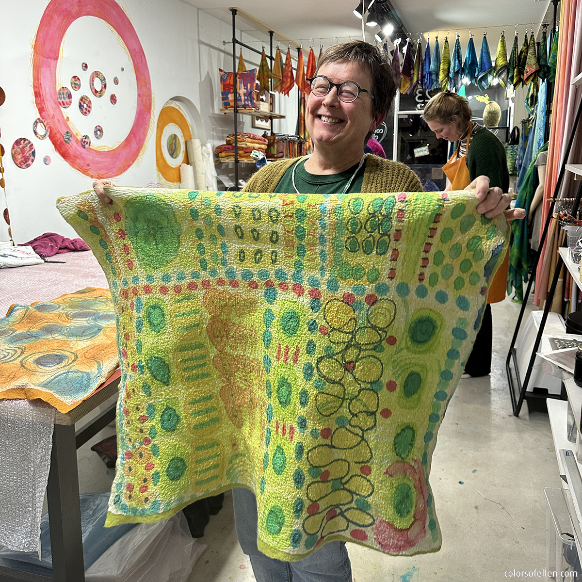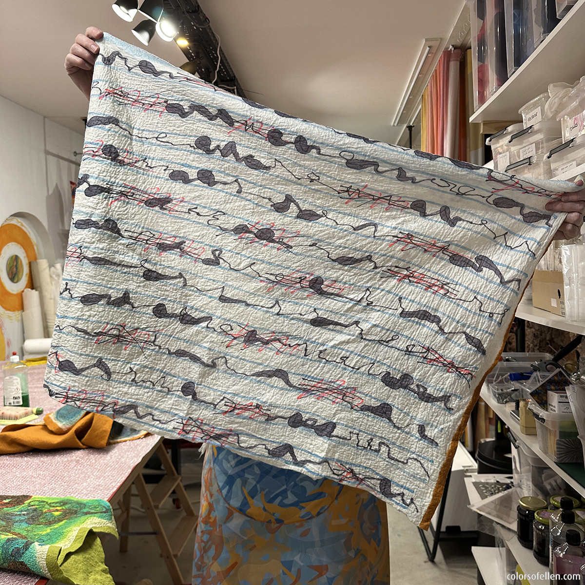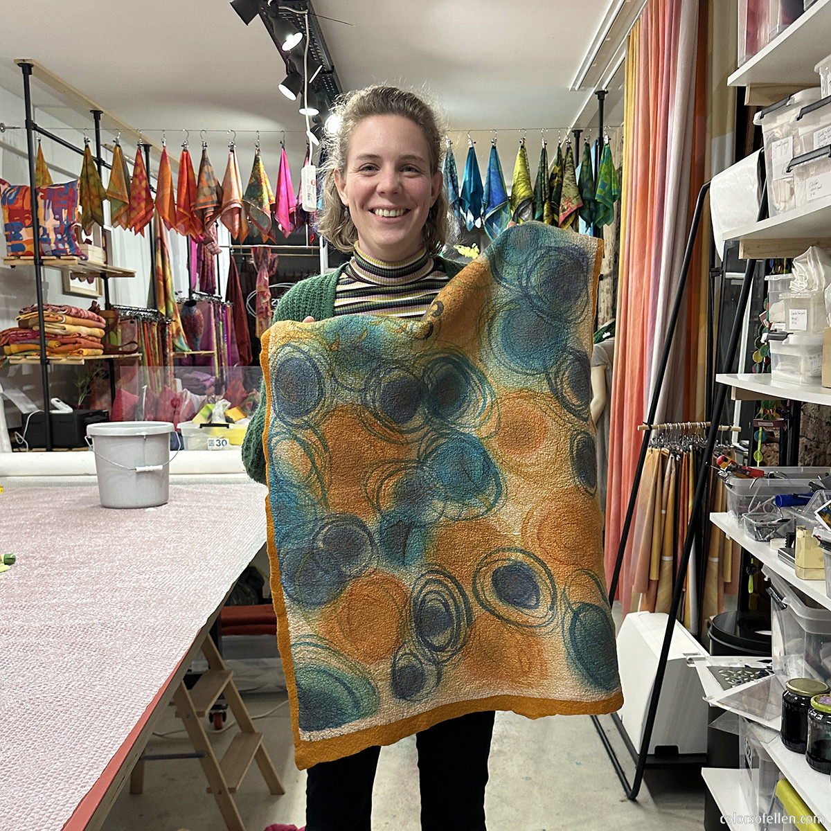 In de middag gaan we de beschilderde zijde vervilten met wol (voorvilt). Met behulp van de viltmachine start het viltproces. Daarna volgt het handwerk, waardoor wol en zijde onverbrekelijk met elkaar verbonden worden en de wol en zijde samen krimpen tot een prachtige vilt. Na het uitspoelen, centrifugeren en strijken kunnen de resultaten mee naar huis. Om er thuis vervolgens wandpanelen, kleding delen, tassen, etuis, boekomslagen, etc. mee te maken … de mogelijkheden zijn eindeloos.