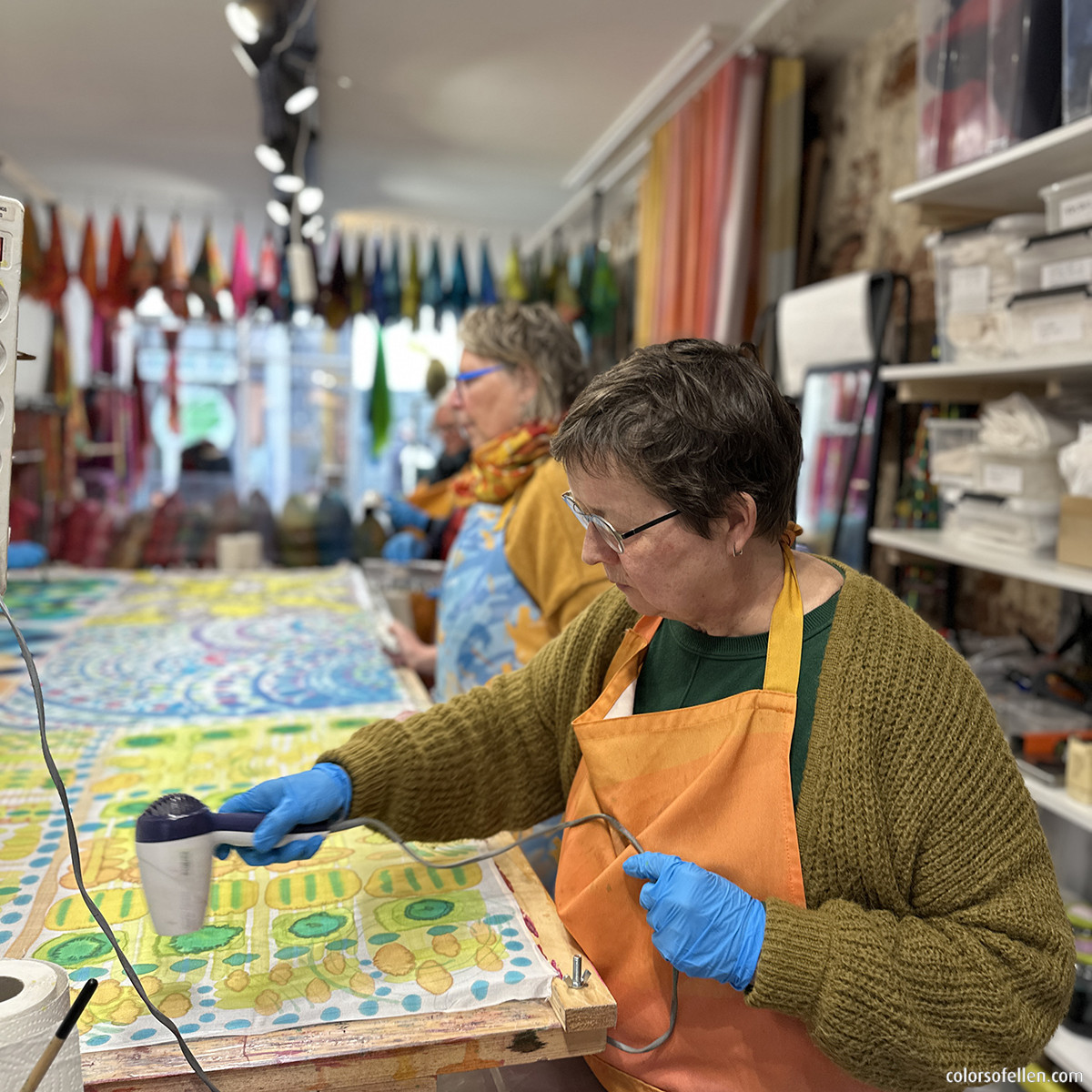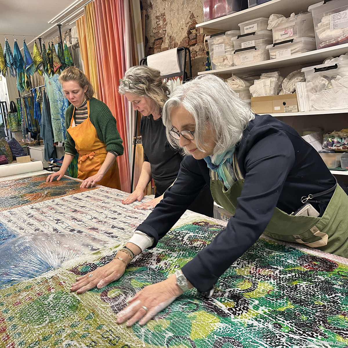 We beginnen met een demonstratie van verschillende zijdeschildertechnieken. Daarna gaat iedereen zelf aan de slag met speciale zijdeverf, kwasten, stempels, markers, enzovoort. Er wordt geschilderd tot lunchtijd. De zijde wordt daarna 2,5 uur in een professioneel stoomapparaat gestoomd.Cursisten kunnen ondertussen lunchen, winkelen of wandelen door het mooie Deventer.